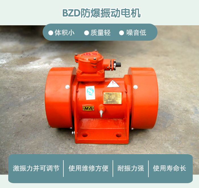 BZD防爆振動電機是一種可以在易燃易爆廠所使用的一種電機,運行時不產生電火花。BZD動電機作為主要的振動篩、振動給料機、振動輸送機、振動料斗和其他振動機械以及振動設備上。